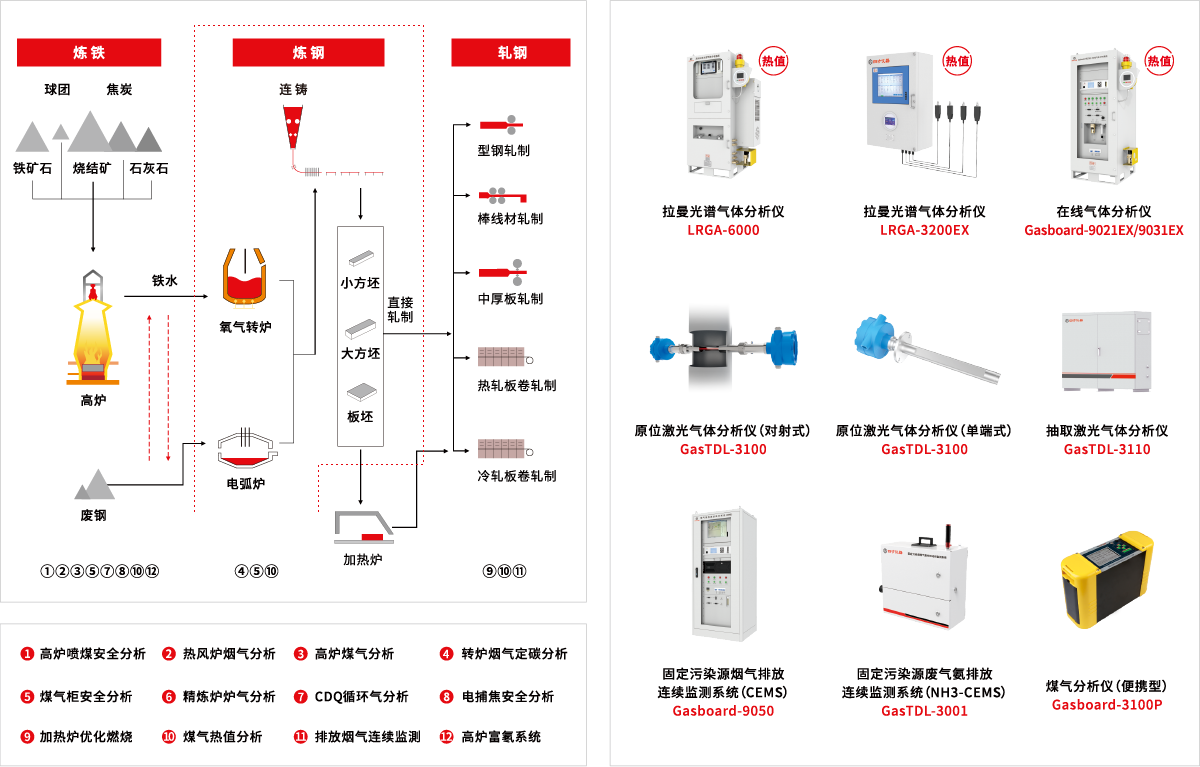 四方儀器憑借其先進的氣體傳感器技術和豐富的工業(yè)監(jiān)測設備開發(fā)經(jīng)驗,針對鋼鐵行業(yè)精心打造了一套融合多種氣體傳感器技術的氣體監(jiān)測綜合解決方案,實現(xiàn)了對鋼鐵冶煉全流程(煉鐵、煉鋼、軋鋼等)的氣體監(jiān)測,精準測量煤氣熱值、爐膛內(nèi)關鍵指標以及環(huán)保限制因子等重要參數(shù),可有效評價爐內(nèi)燃燒狀態(tài),合理調(diào)節(jié)各種爐型的熱工參數(shù),從而助力鋼鐵行業(yè)的節(jié)能減排行動。